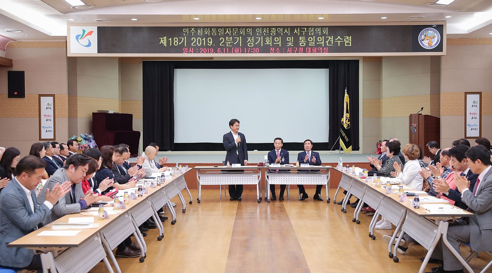 민주평화통일자문회의 인천광역시서구협의회(회장 유정학)는 지난 11일 서구청 지하 대회의실에서 자문위원과 이재현 서구청장(대행기관장) 등 50명이 참석한 가운데 ‘제18기 2019년 2분기 정기회의 및 통일의견수렴’을 개최했다.