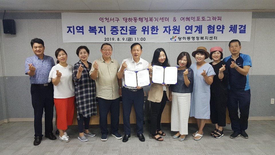 인천 서구 당하동(동장 김기선)은 9일, 여혜민 포토그라피와 지역사회 복지사업 협력 및 문화․복지 확대를 위한 업무협약을 체결했다.