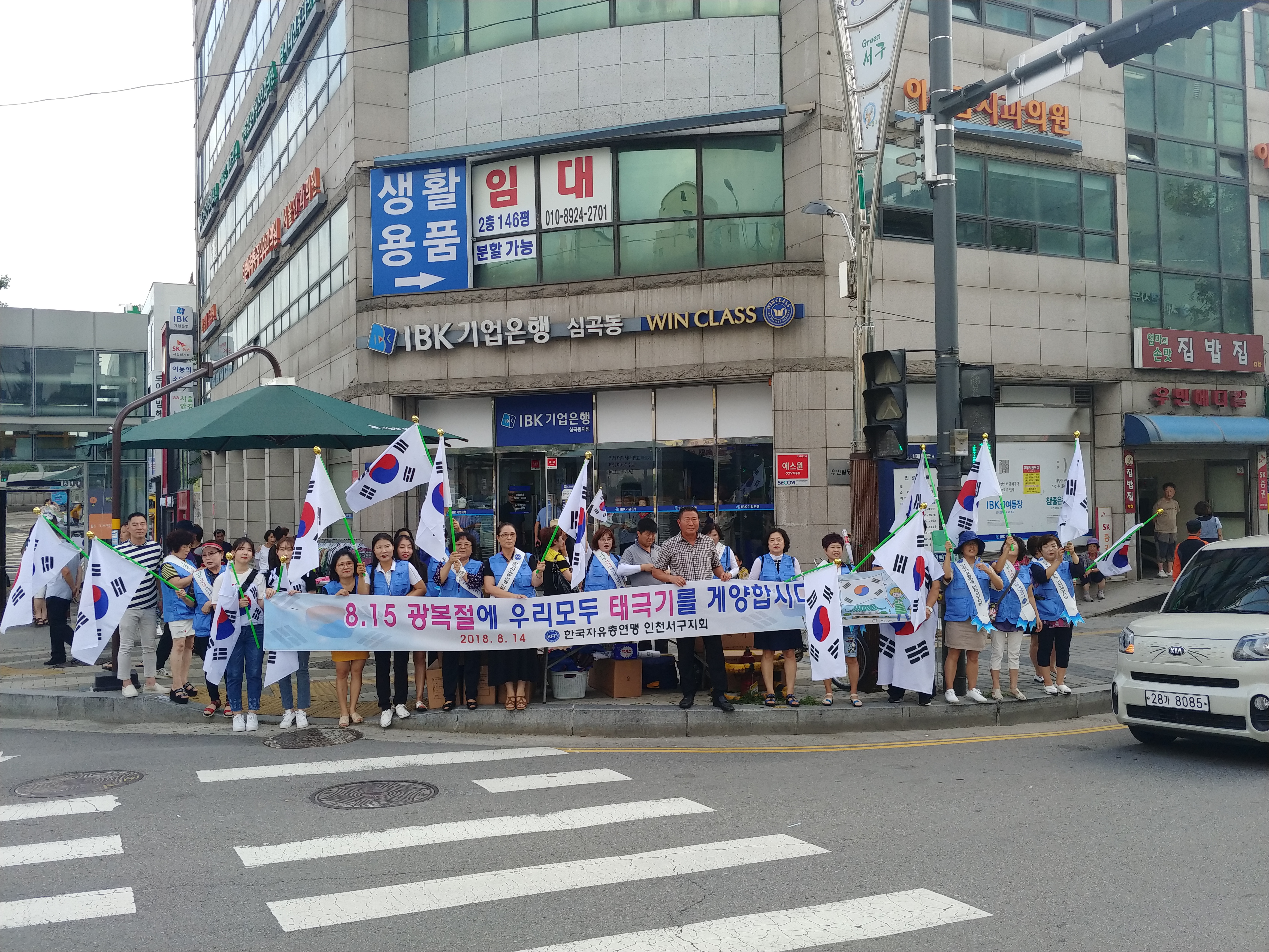 이날 한국자유총연맹 인천서구지회 회원 60여명은 광복절을 맞아 선열들의 숭고한 독립정신을 계승·발전시키고 국가발전에 국민적 역량을 집결시키고자 서구청역 사거리에서 가정용 태극기 800조, 차량용 태극기 500조를 배부하고 서구민 태극기 달기 거리 캠페인을 전개했다.