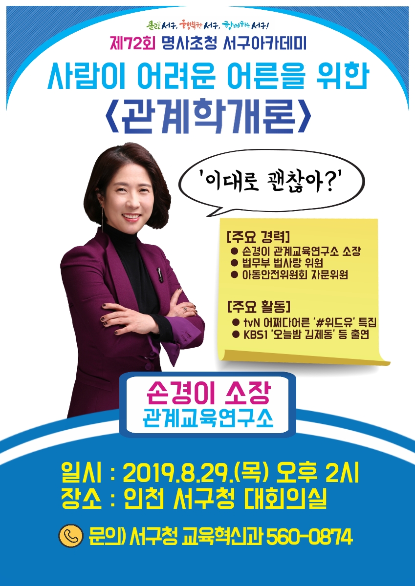 인천 서구(구청장 이재현)는 오는 29일(목) 오후 2시 서구청 대회의실에서 관계교육 전문가 손경이 강사를 초청해 ‘제72회 명사초청 서구아카데미’를 개최한다.