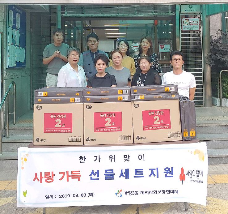가정3동지역사회보장협의체(동장 김원상, 공동위원장 신순옥)에서는 민족 고유의 명절인 추석을 맞이하여 소외되고 어려운 이웃들과 따뜻한 온정을 나누기 위해 지난 3일 100만원 상당의 선물세트 30세트를 전달하였다.