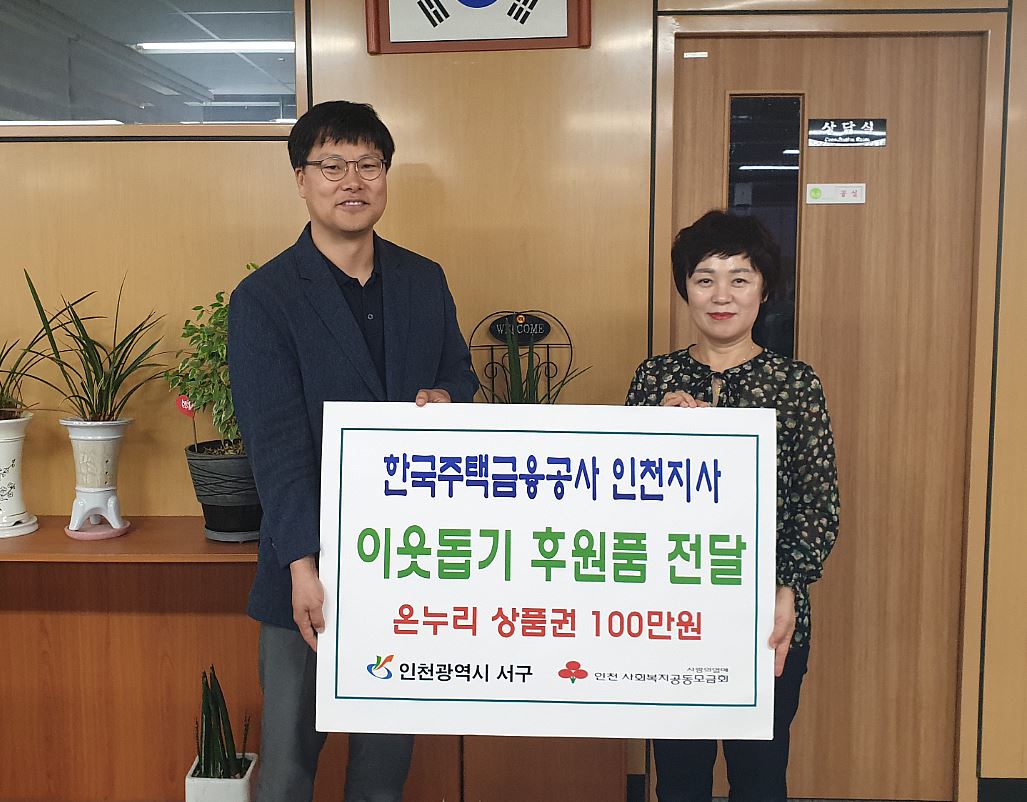 한국주택금융공사 인천지사(지사장 최상철)는 지난 4일, 인천서구(구청장 이재현)에 방문해 이웃돕기 온누리상품권(100만원 상당)을 어려운 이웃을 위해 사용해 달라며 전달했다.