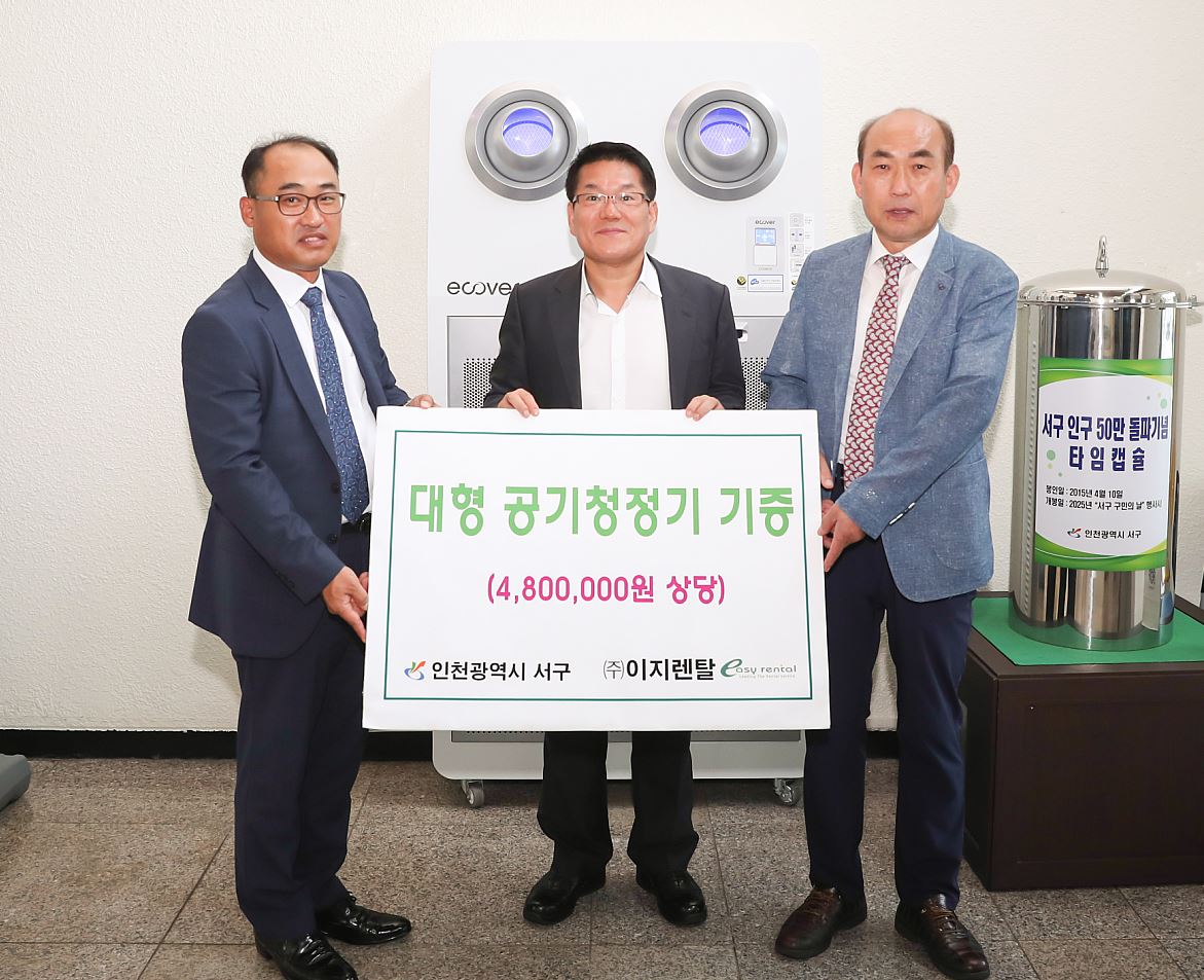 인천 서구(구청장 이재현)는 지난 5일 변주영 부구청장, ㈜이지렌탈 대표 박관병, 부장 최재명 등이 참석한 가운데 480만원 상당의 대형 공기청정기를 기증하는 행사를 진행했다.