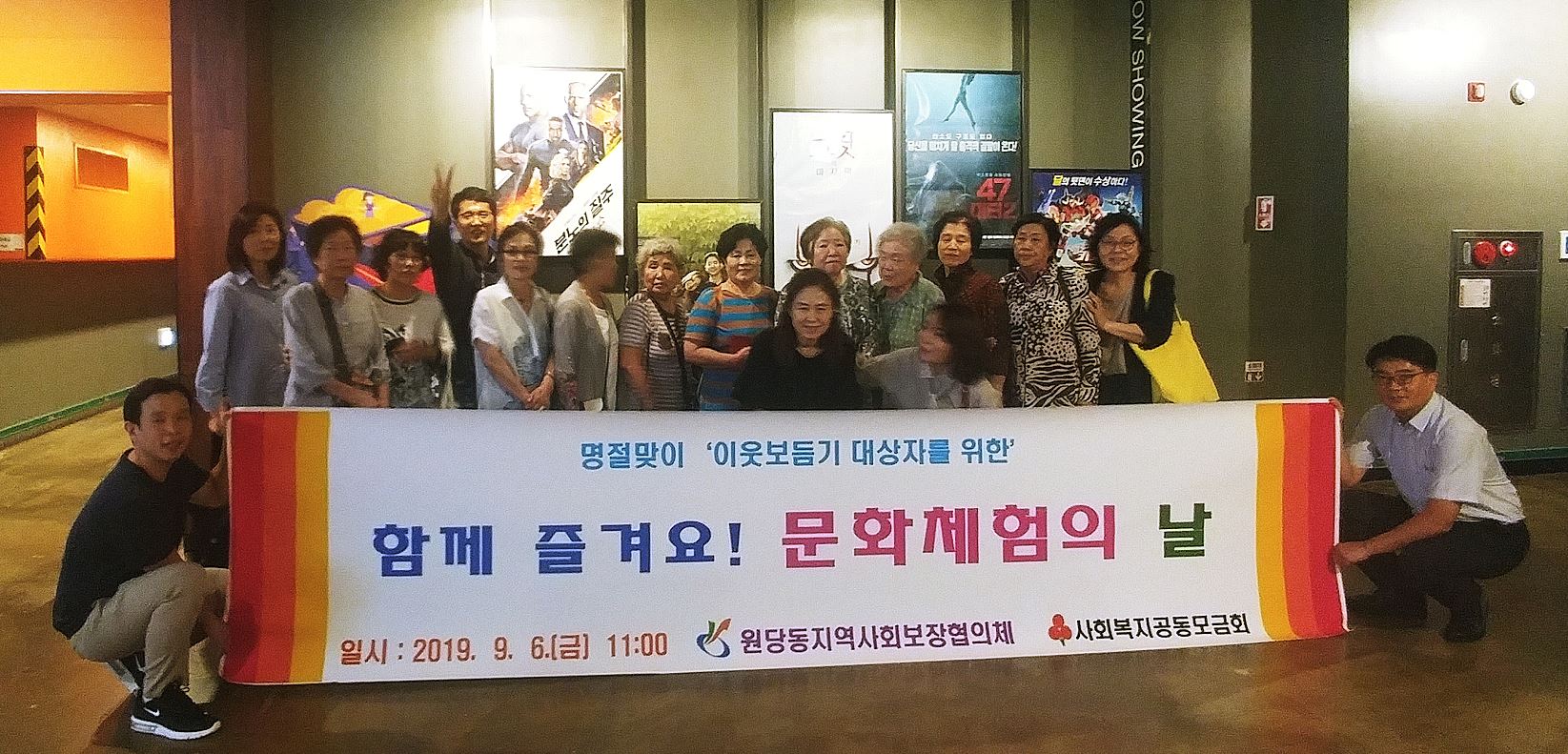 이번 문화체험은 추석을 맞이하여 독거노인들을 위로하고 영화관람하는 것으로 진행되었는데, 거동이 불편한 어르신들을 위해 원당동지역사회보장협의체 위원들이 동행하여 이들을 수발하고 함께 담소를 나누는 등 즐거운 시간을 보냈다.