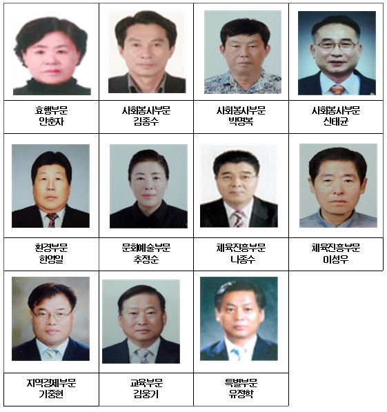 부문별 수상자로는 효행상 부문 안춘자(여, 61세), 사회봉사부문 김종수(남, 64세), 박명복(남, 68세), 신태균(남, 63세), 환경부문 한영일(남, 77세), 문화예술부문 추정순(여, 60세), 체육진흥부문 나종수(남, 58세), 이성우(남, 72세), 지역경제부문 기중현(남, 62세), 교육부문 김웅기(남, 63세), 특별부문 유정학(남, 55세) 등 11명이 선정됐다.