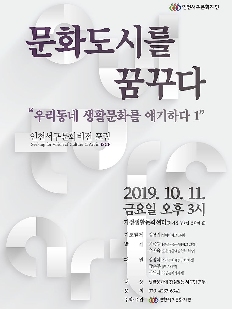 인천서구문화재단 관계자는 “인천서구는 지역민의 공론화를 거쳐 구민이 함께 만드는 문화도시를 지향하며, 본 포럼은 구민들이 바라는 문화도시의 미래상을 논의하는 자리가 될 것”이라 전했다.