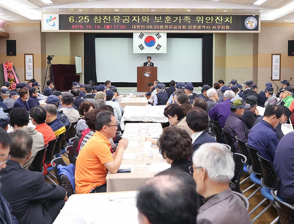 6.25참전유공자 인천광역시 서구지회(회장 강용희)는 서구청 지하대회의실에서 보훈단체 각 지회장과 보훈회원 400여 명이 참석한 가운데 ‘6.25참전유공자와 보훈가족 위안잔치’를 지난 14일 개최했다.