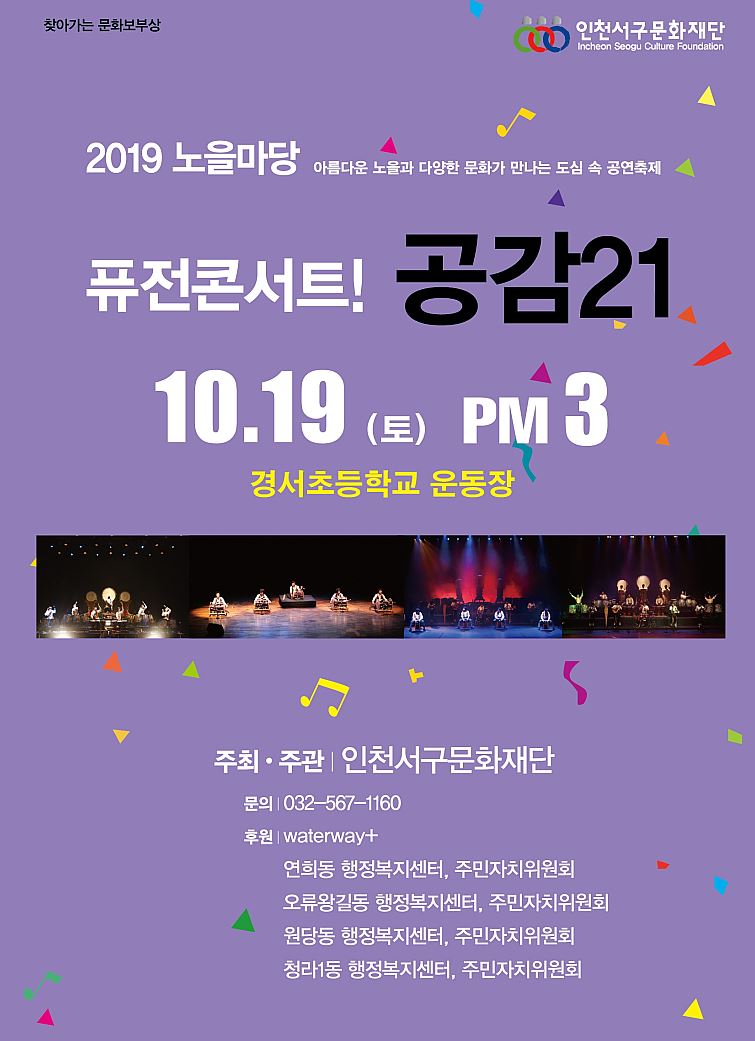 뿐만 아니라 찾아가는 음악회 “노을마당” 역시 오는 19일(토) 오후 3시, 인천경서초등학교 운동장에서 “퓨전콘서트! 공감21”이라는 주제로 유쾌한 공연을 선보일 예정이다.