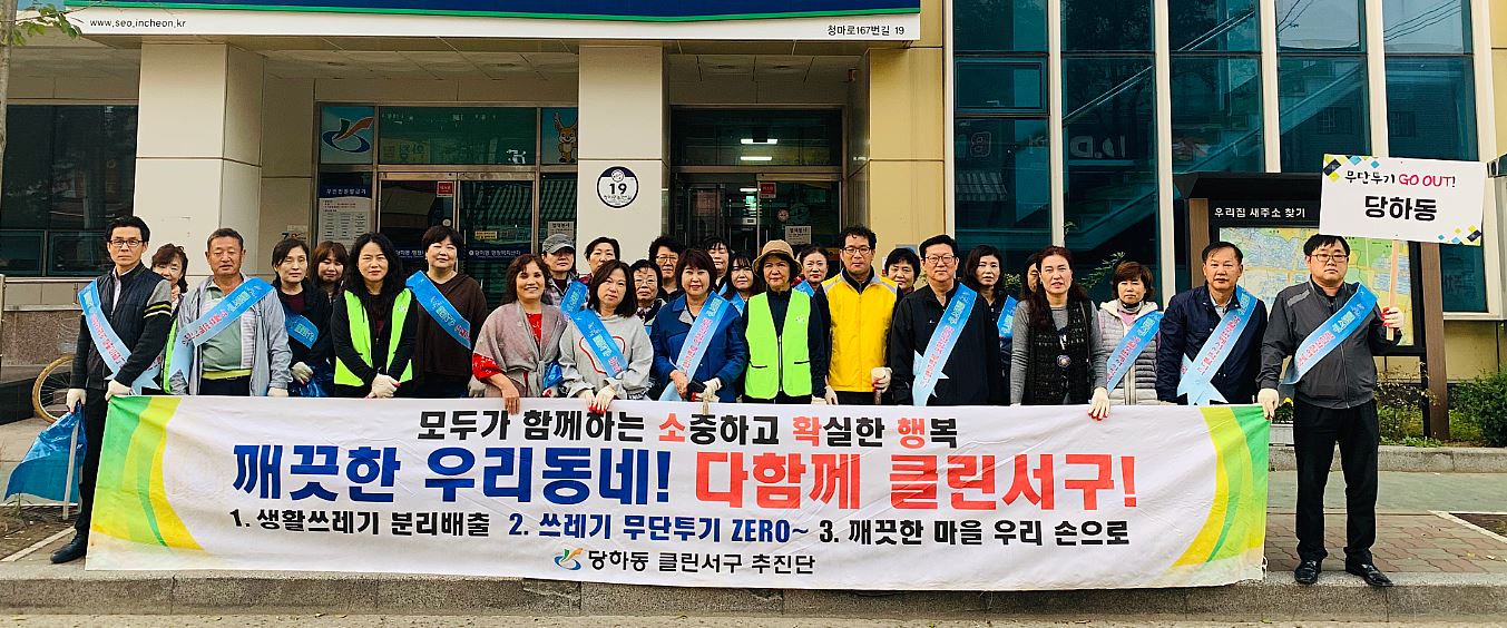 인천 서구 당하동(동장 김기선)은 지난 22일, 6개 자생단체 회원과 동 행정복지센터 공무원이 함께 깨끗한 당하동을 만들기 위한 클린업데이 환경정비와 음식물 쓰레기 제로 실천운동 캠페인을 실시했다.