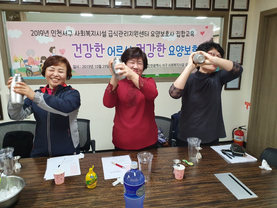 요양보호사 교육은 1부 어르신의 올바른 식사 자세와 치매 어르신 식사 도움 교육을, 2부에서는 무알콜 칵테일을 만들고, 스트레칭 로프와 지압봉을 이용하여 업무로 인해 쌓인 피로를 풀어보는 시간을 진행됐다.
