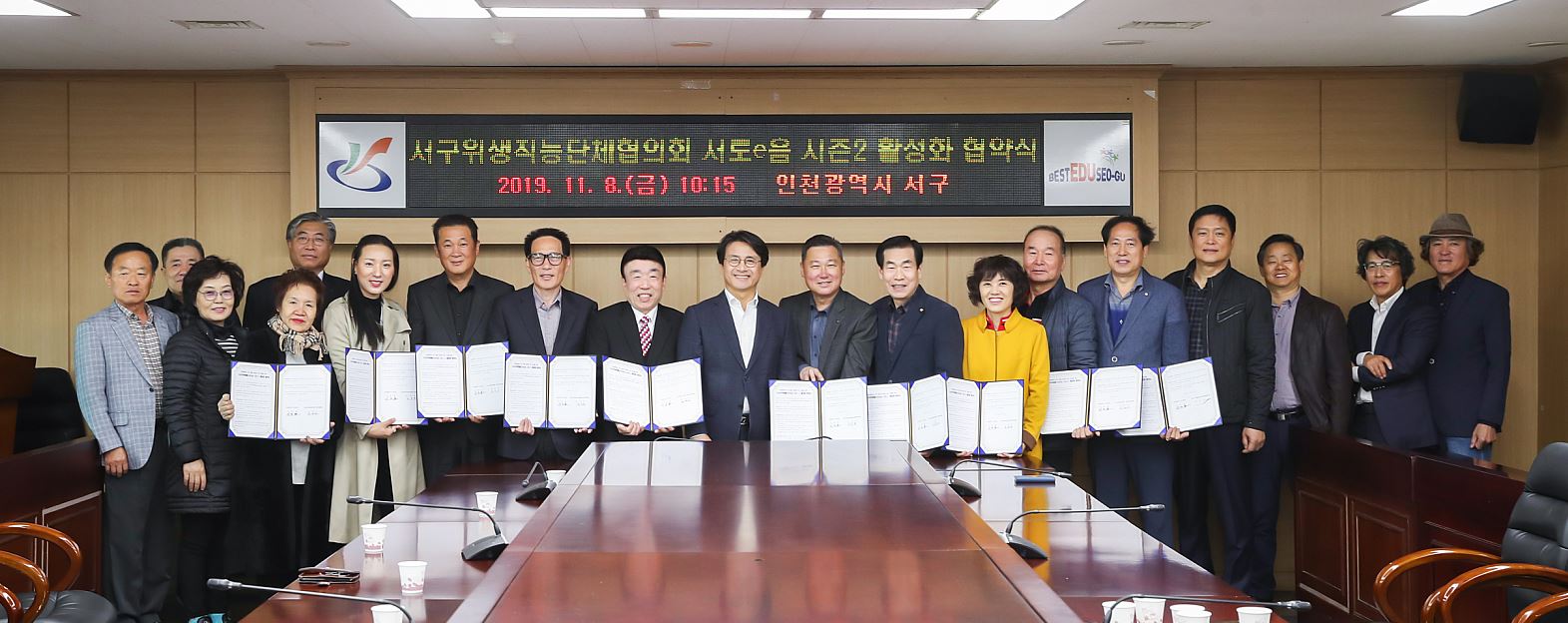 이번 협약은 지난 4월의 시즌1인 서로e음카드 이용 확산을 위한 협약식에 이어 한국외식업중앙회인천서구지부 및 서구식품제조가공업협의회, 대한제과협회, 추출가공식품업협회와 공중위생분야의 한국이용사회, 대한미용사회, 한국피부미용사회, 대한숙박업회, 한국세탁업회, 한국목욕업협회 등 10개 단체(업소수 약10,620개)로 구성된 서구위생직능단체협의회와 서로e음 시즌2 활성화를 위해 진행됐다.
