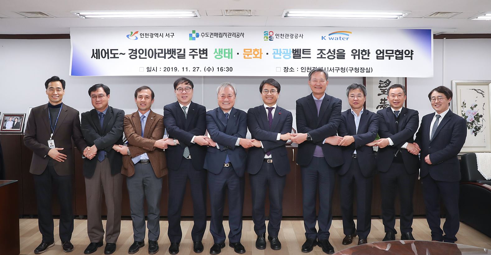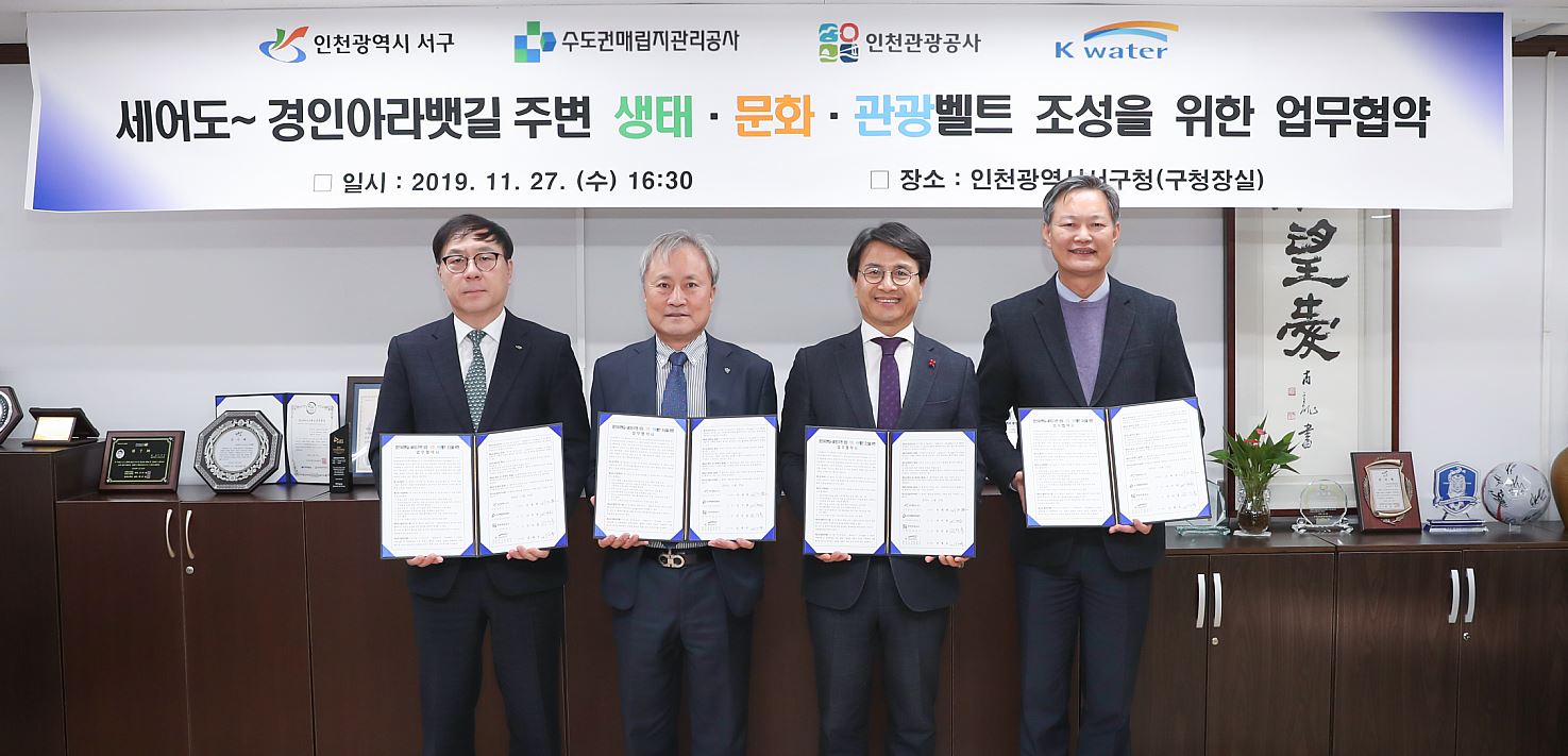 인천 서구(청장 이재현)는 지난 27일 수도권매립지관리공사, 인천관광공사, 한국수자원공사와 함께 세어도~경인아라뱃길 주변 생태·문화·관광벨트 조성을 위한 협약을 체결했다고 밝혔다.