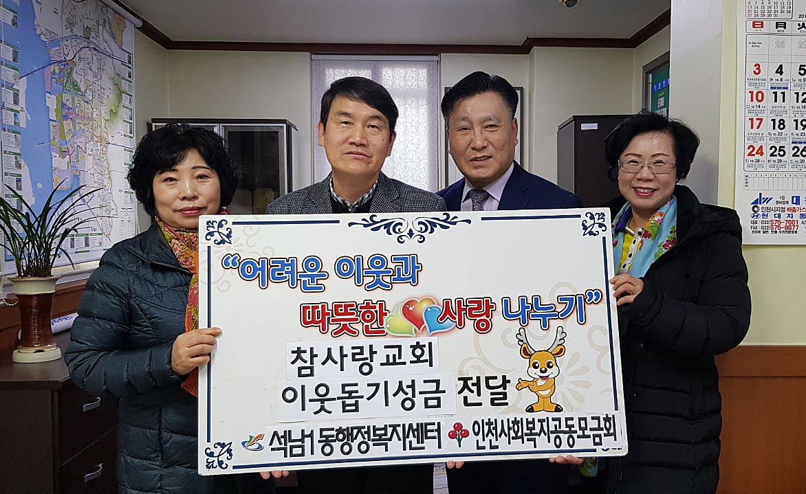 인천 서구 석남1동에 소재한 참사랑성결교회(담임목사 박성영)는 지난 27일 이웃돕기성금 166만5천원을 석남1동 지역사회보장협의체(동장 박병노, 공동위원장 김대중)에 전달했다.