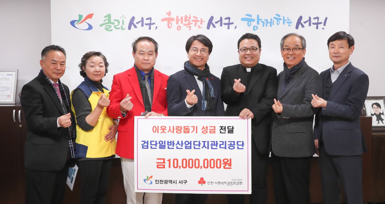 인천 서구(구청장 이재현) 오류동에 소재한 검단일반산업단지관리공단(이사장 이광균)은 지난 10일 이웃사랑 성금 1천만만원을 서구청에 전달했다.