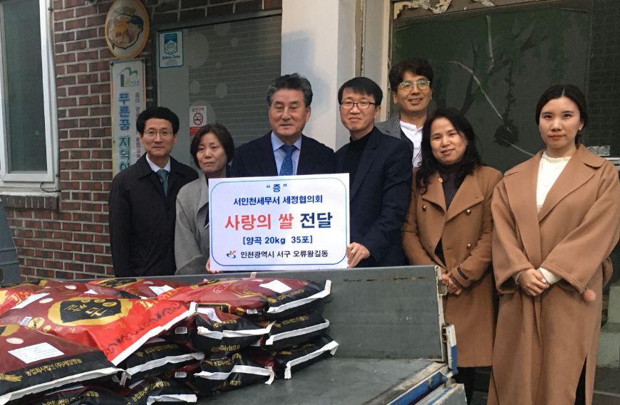 서인천세무서 세정협의회와 거승철강(주)(대표 김성복)에서는 지난 16일 오류왕길동 취약계층들을 위해 지원해 달라며 양곡(20kg) 35포를 오류왕길동행정복지센터(동장 최흥진)에 전달했다.