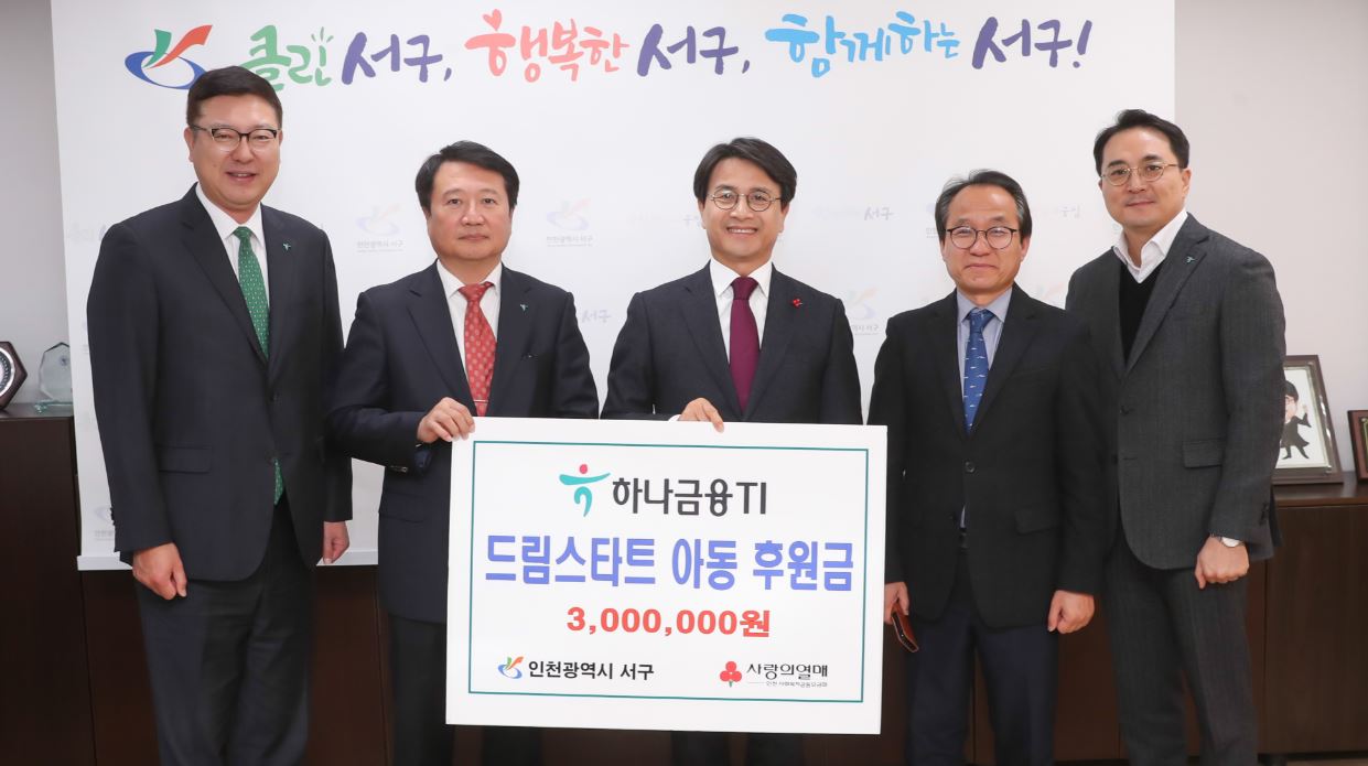 인천 서구(청장 이재현) 드림스타트는 지난 20일 하나금융티아이(대표이사 유시완) 임직원들이 방문한 가운데 드림스타트 아동을 위한 후원금 전달식을 진행했다.