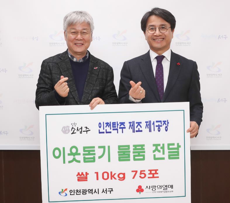인천탁주(대표 정규성)는 다가오는 설을 맞아 쌀 75포(10kg)를 지난 2일 인천 서구(구청장 이재현)에 전달했다.