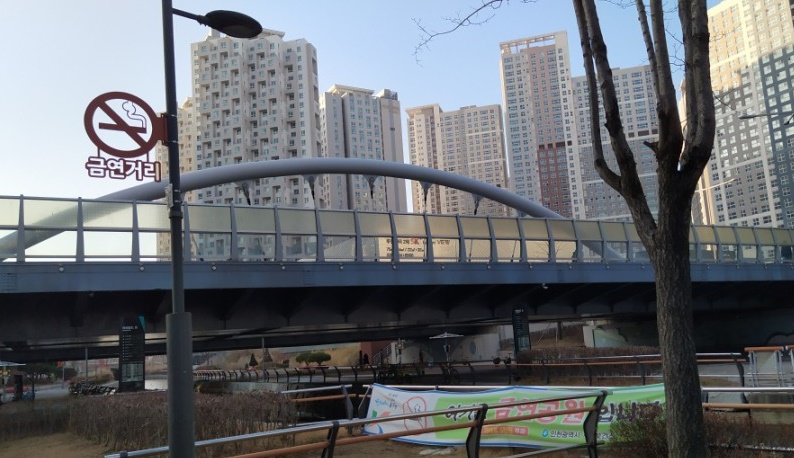 이번에 안내표지판을 설치한 청라커널웨이 수변공원에는 '금연거리' 돌출형 간판을 설치해 주민들의 눈에 잘 띄도록 했다. 상가가 공원에 포함돼 있어 흡연자들이 금연공원이라는 것을 잘 인지하지 못한다는 판단에서다. 또한 바닥에는 매립식 금연 안내표지판을 설치해 경각심을 갖도록 유도했다.