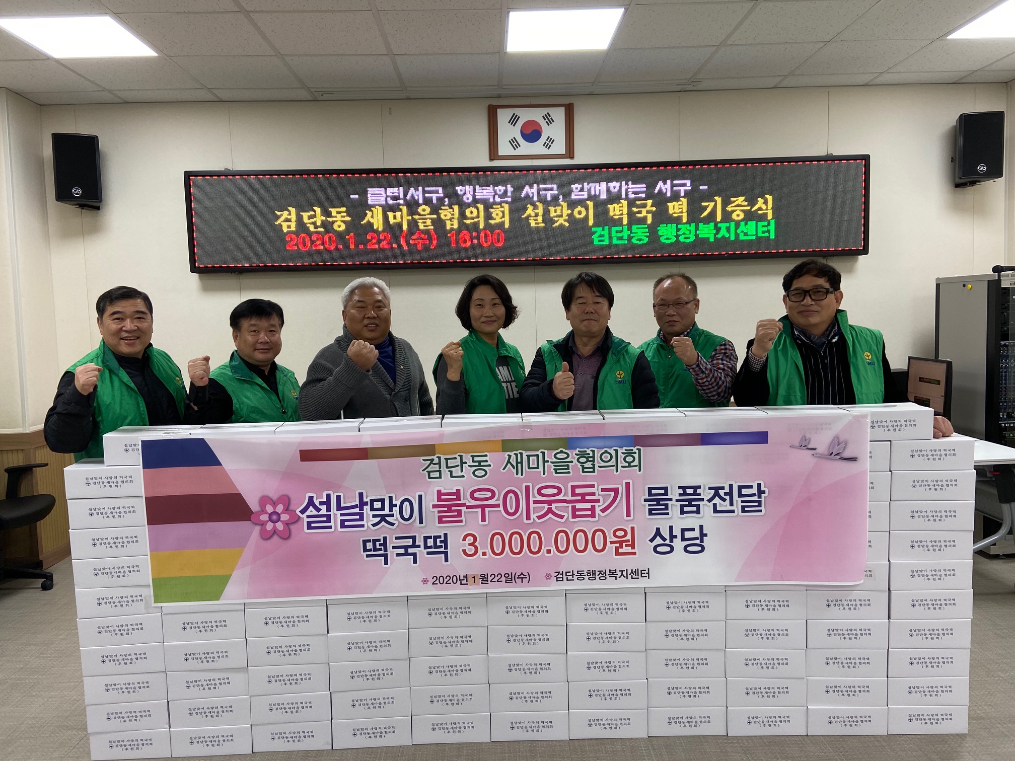 검단동 새마을협의회(회장 김진옥)는 지난 22일(수), 민족 최대의 명절인 설을 앞두고 떡국조리용 떡, 약 300만 원 상당을 검단동 행정복지센터에 기탁하였다.