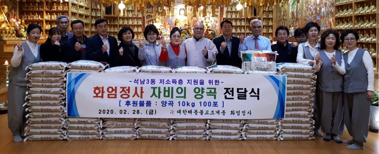 사단법인 대한해동불교조계종 화엄정사(주지 보광스님)는 지난달 28일 어려운 이웃들을 돕기 위해 양곡(10kg) 100포를 석남3동 행정복지센터(동장 노화영)에 전달했다.