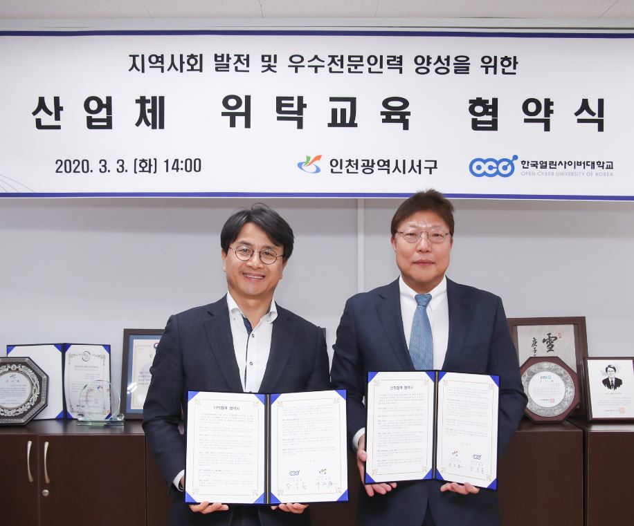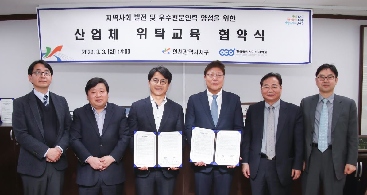 인천 서구(구청장 이재현)는 지난 3일 한국열린사이버대학교(총장 장일홍)와 지역사회 발전, 우수 전문인력 양성 및 상호 공동발전 등 역량 강화를 위한 산업체 위탁교육 협약을 체결했다.