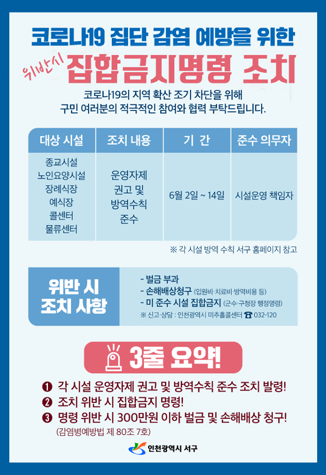 서구는 인천시와 함께 이들 시설에 대해 방역지침과 위반 시의 벌칙 등을 안내하고 현장 점검을 통해 조치 위반 시 집합금지 명령, 명령 위반 시 300만 원 이하 벌금 및 손해배상 청구 등의 조치를 취할 방침이다.