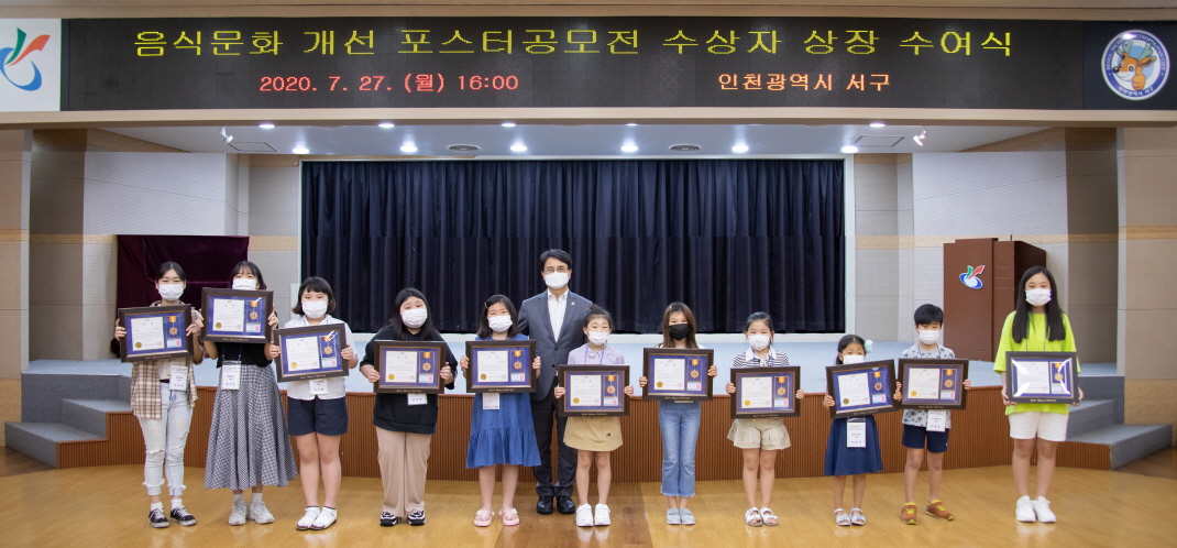 이날 상장 수여식에선 ‘포스트 코로나 음식문화 개선 포스터 공모전’에서 서구청장상을 받게 된 초등·중학생 12명에게 상장이 전달됐다.