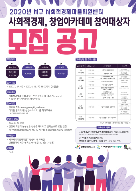 인천 서구 사회적경제마을지원센터는 사회적경제에 대한 인식 확산과 능력 있는 사회적 기업가를 발굴‧양성하기 위해 ‘2020년 사회적경제, 창업아카데미’ 참여자를 모집한다고 3일 밝혔다.
