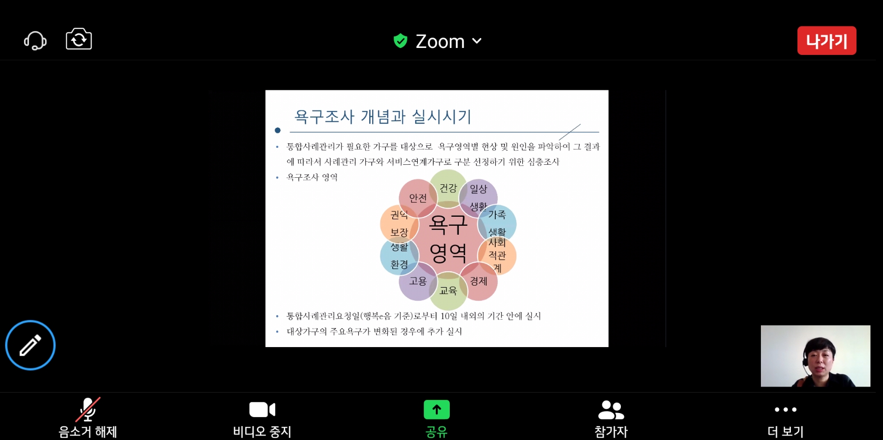 이 자리는 통합사례관리에 대한 개념 정의와 대상자 발굴에서 사후관리까지 단계별 실천방법에 대한 이해를 도와 사례관리 담당자의 직무능력을 향상하고 대상자의 서비스 만족도를 높이기 위해 마련됐다.