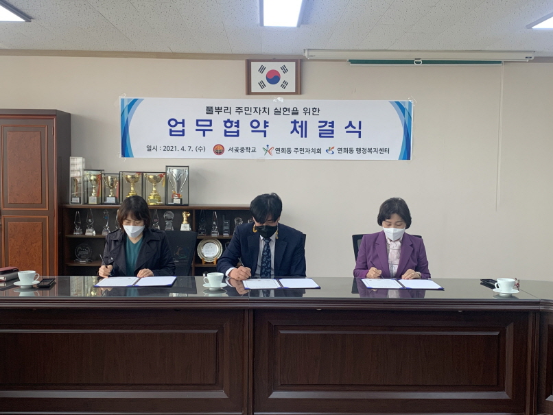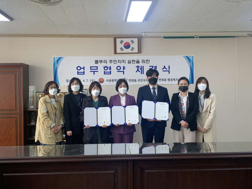이날 협약은 주민자치와 교육 간의 협업을 통해 미래 세대에게 직접 민주주의를 경험하는 기회를 제공하고자 마련됐으며, 협약 내용에 따라 연희동 주민자치회의 ‘자라는마을분과(청소년 분과)’에서 서곶중학교 학생들이 활동할 수 있도록 지원하게 된다.