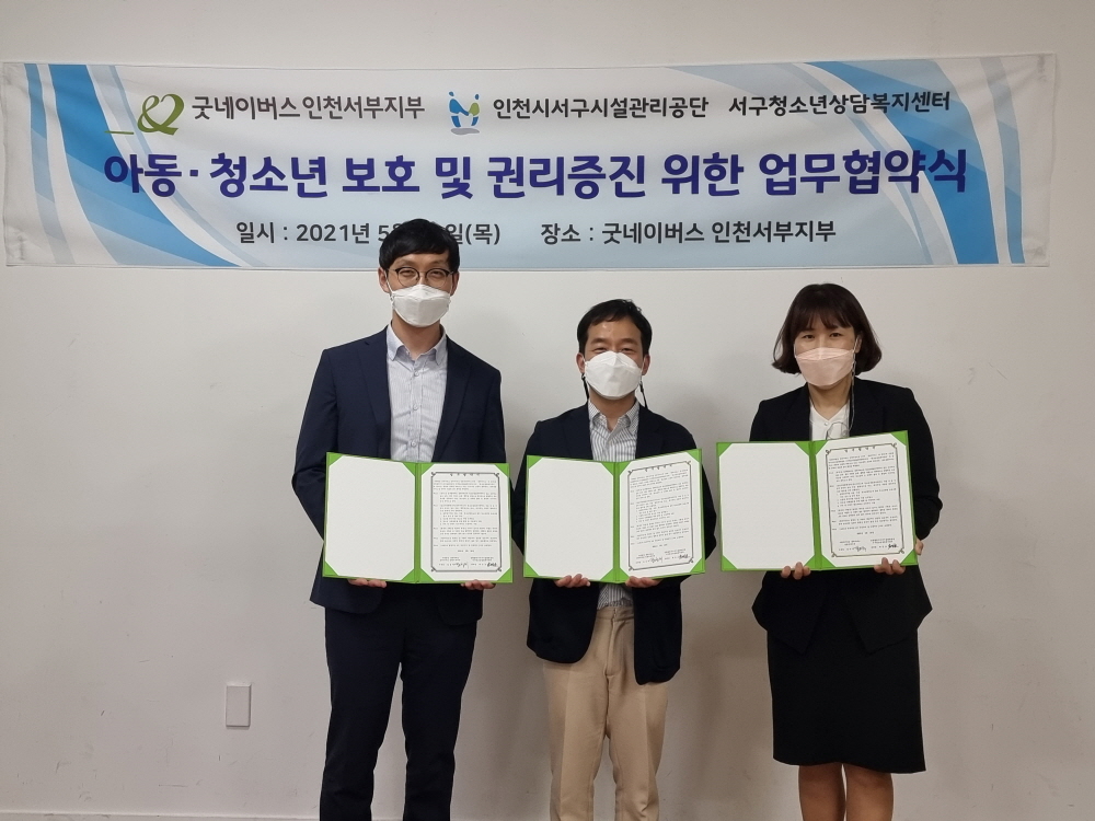 인천 서구(구청장 이재현)에서 지원·운영하는 서구청소년상담복지센터는 지난 20일 관내 아동·청소년의 복지서비스 향상 및 청소년 안전망의 내실화를 위해 굿네이버스 인천서부지부 좋은마음센터, 굿네이버스 인천서부지부 아동권리센터와 다자간 업무협약을 체결했다.