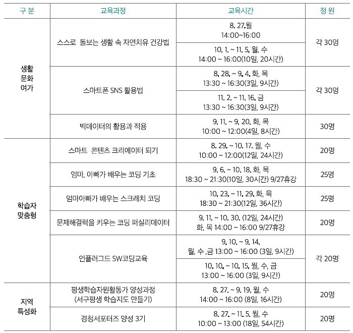 ○ 교육장소 : 서구 평생학습관 강의실 1, 2, 정보화교육실(서구청 본관 지하1층)