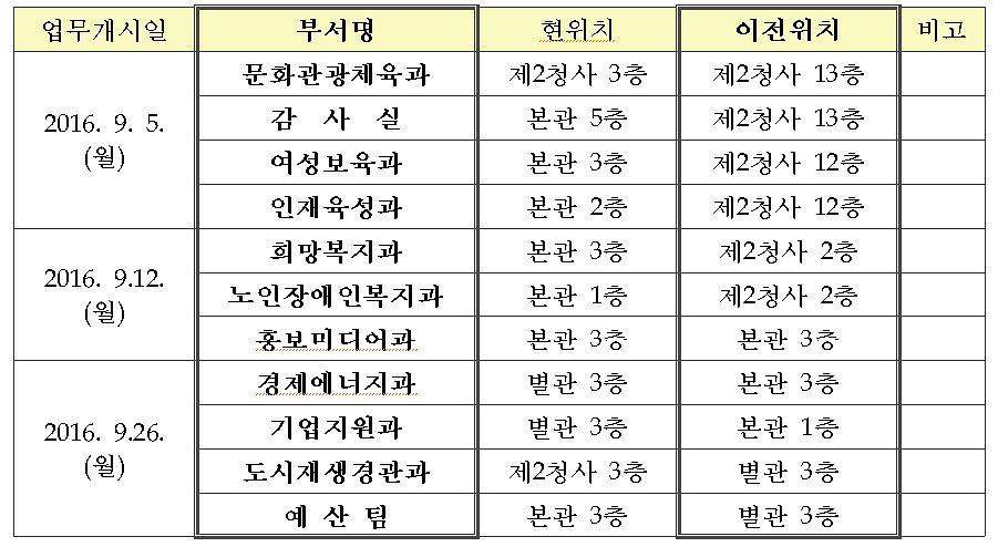 인구 50만시대에 걸맞는 청사 확충 및 재배치 계획에 따라, 구민 편의 증대와 보다 나은 대민행정서비스 제공을 위해 일부 부서가 아래와 같이 이전하여 업무를 개시합니다.