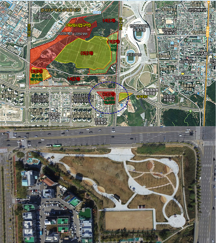 연희공원 서측부지는 청라국제도시와 인접지역으로 인천시는 총사업비 29억 원을 투입해 파고라, 족구장, 화장실 등의 편의시설과 산책로 등을 조성했다.