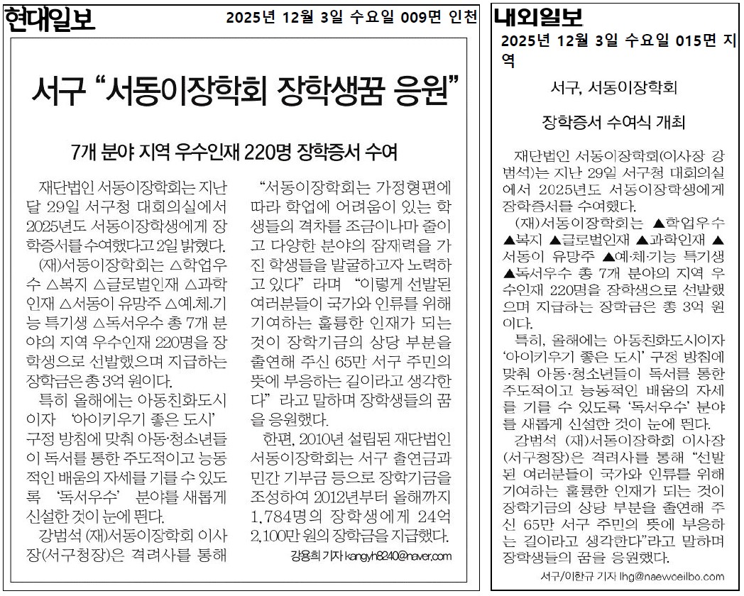 2025년도 재단법인 서동이장학회 장학증서 수여식 개최