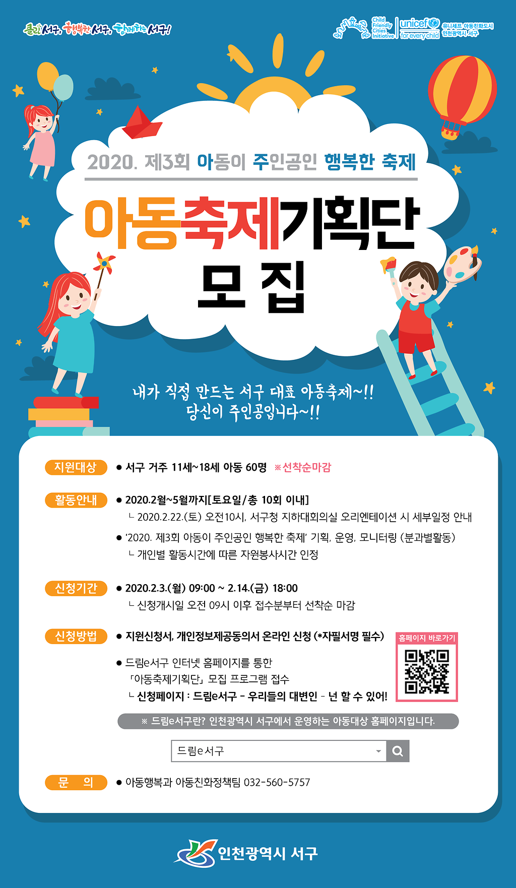 ▶ 지원대상 : 서구 거주 11세~18세 아동 60명(*선착순마감) ▶ 활동안내 : 2020. 2월~5월까지[토요일/총10회 이내] - 2020.2.22.(토) 오전 10시, 서구청 지하대회의실 오리엔테이션 시 세부일정 안내 '2020. 제3회 아동이 주인공인 행복한 축제' 기획, 운영, 모니터링(분과별활동) - 개인별 활동시간에 따른 자원봉사시간 인정 ▶ 모집기간 : 2020. 2. 3.(월) 09:00 ~ 2. 14.(금) 18:00 (* 신청개시일 오전 09시 이후 접수분부터 선착순 마감) ▶ 신청 방법 : 지원신청서, 개인정보제공동의서 온라인 신청(*자필서명 필수) 드림e서구 인터넷 홈페이지를 통한 '아동축제기획단' 모집 프로그램 접수 - 신청페이지 : 드림e서구 - 우리들의 대변인 - 넌 할 수 있어! http://www.seo.incheon.kr/open_content/dreame/spokesman/ucandoit.jsp (*드림e서구란? 인천광역시 서구에서 운영하는 아동대상 홈페이지입니다.) ▶ 문 의 : 아동행복과 아동친화정책팀 032-560-5757