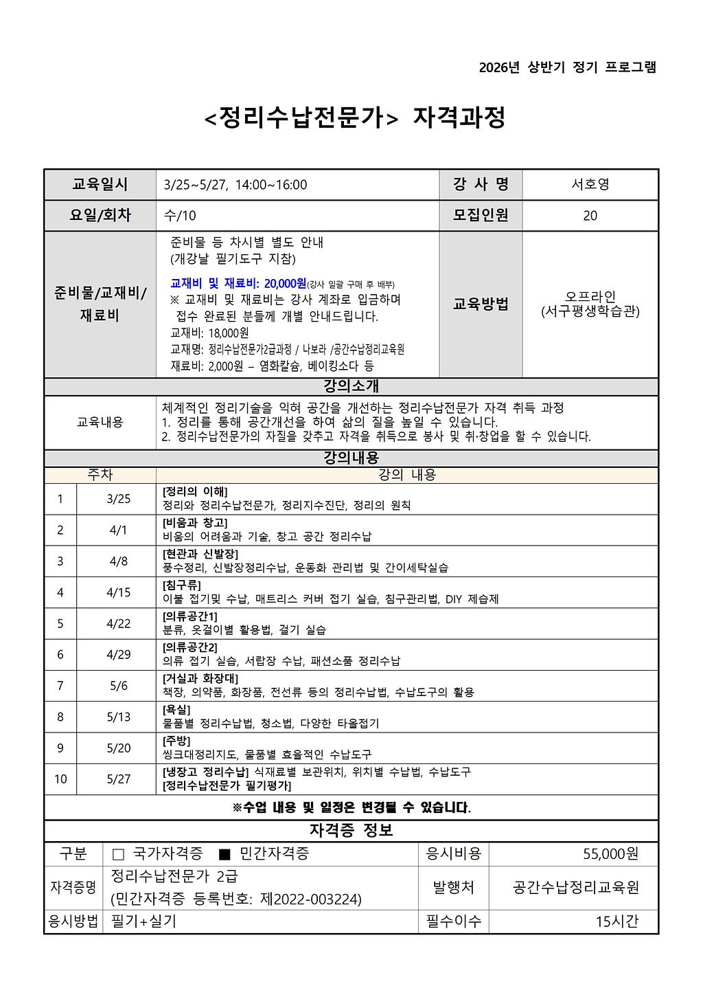 - 재료·교재는 납부 인원 기준으로 사전 준비되므로 개강일 이후에는 재료비·교재비 환불이 불가하오니 수강신청 전 반드시 유의하시기 바랍니다. 개강일 이후에는 환불 불가하며 해당 재료·교재를 수령하여야 합니다.