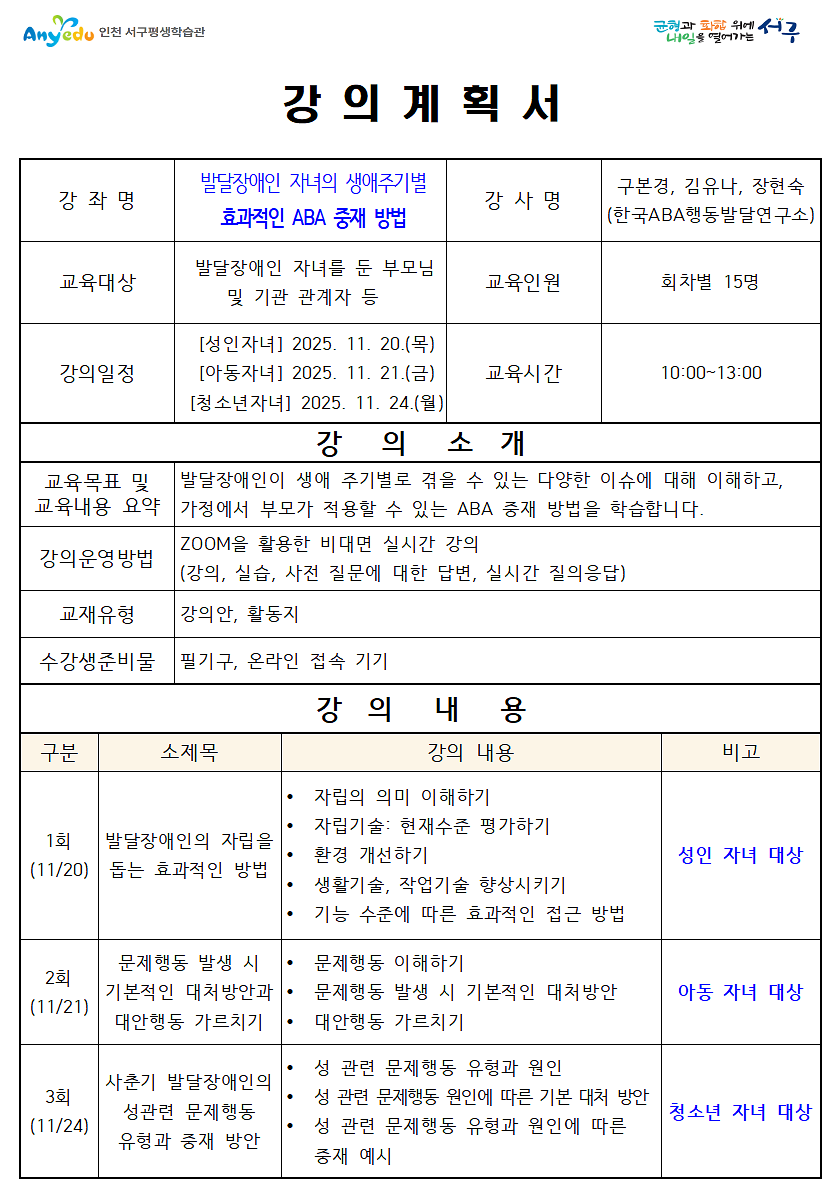 [장애인 평생학습도시] 발달장애인 자녀의 생애주기별 효과적인 ABA 중재 방법