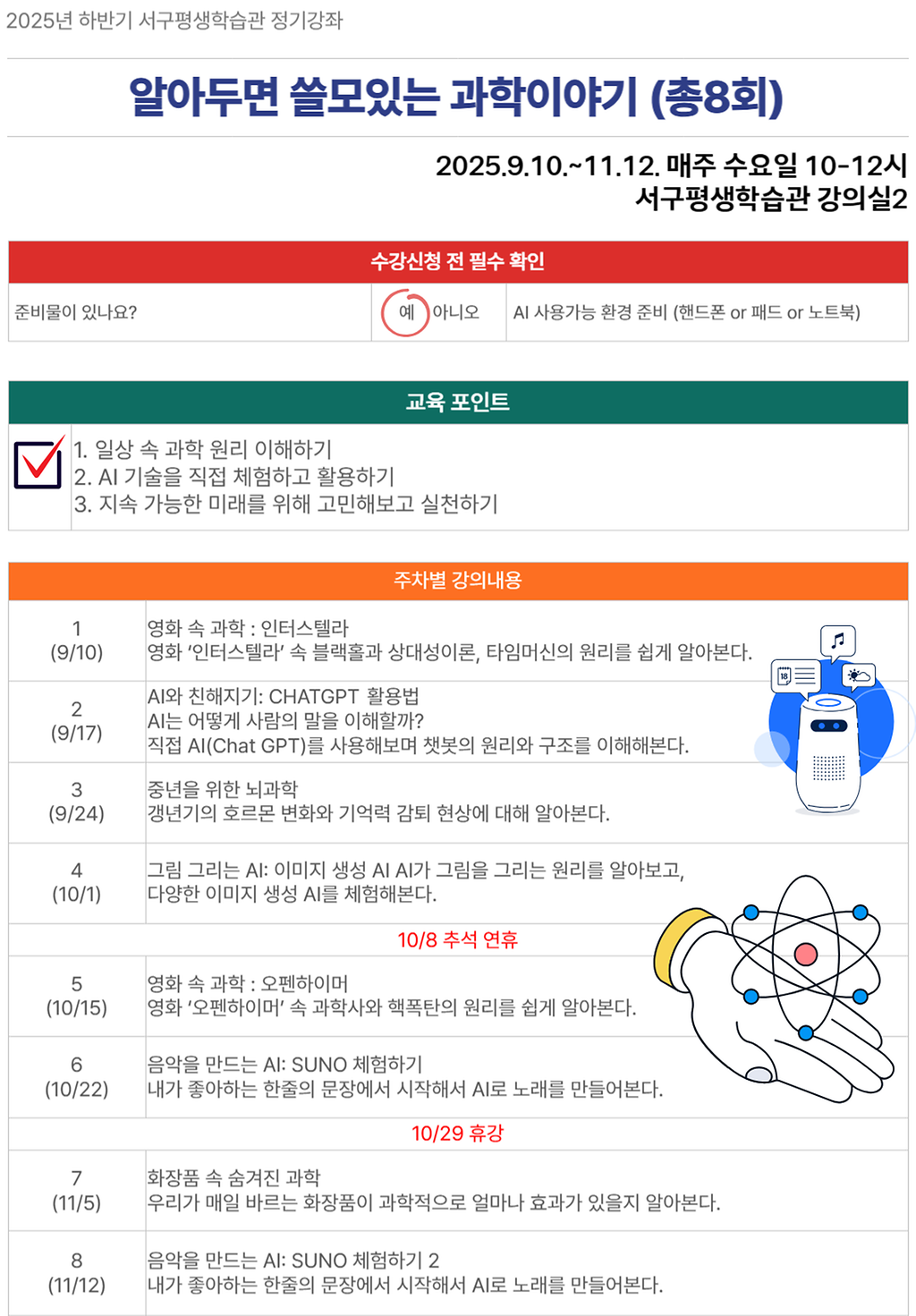 ※ 서구평생학습관의 정기강좌는 선착순 신청입니다.